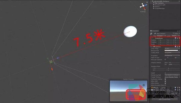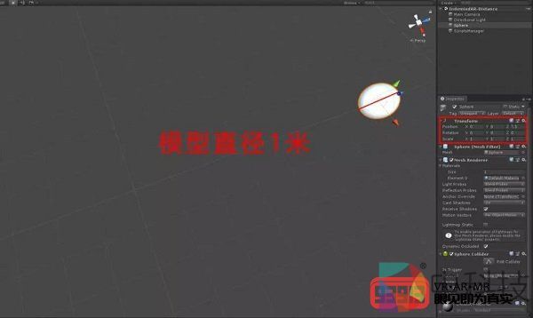 在程序中,于原始点直线距离7.5米处放置球体模型。