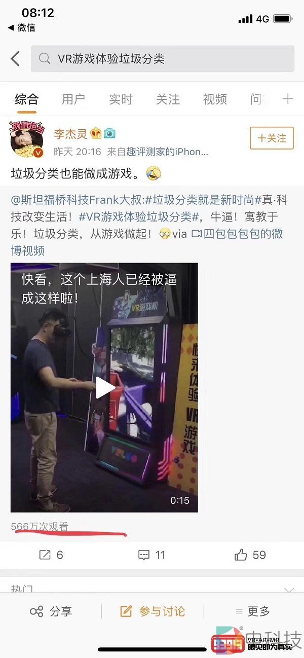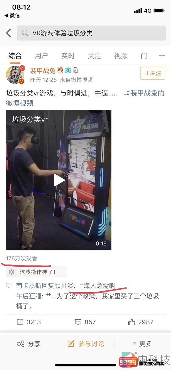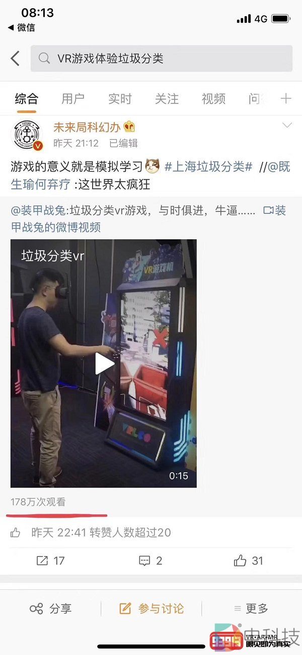 搜索VR(虚拟现实),我们发现VR游戏体验垃圾分类都登上了微信和微博热点,VR的沉浸式感可以让人全身心地投入其中,身临其境的现场还原能让人们全神贯注地体验,而游戏模式无疑是最容易理解的垃圾分类解决方案。