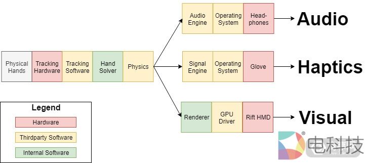 此外,单独测量体感反馈的时延还不够,想要实现体感手套与VR之间的低延时体验,需要考虑的是整个端对端体验的时延,也就是说要考虑多个方面,包括:硬件追踪系统、内部软件、第三方软件、设备驱动和输出硬件。而且为了更完整的优质体验,体感反馈、VR影像和音频的时延都需要得到测量和优化。