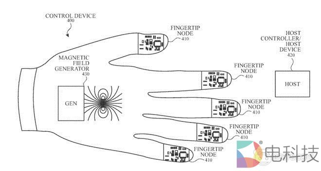 在 第二个名为“基于磁传感器的接近感应”专利申请中,苹果回到了人们熟悉的基于手套的设备交互概念。据称,磁感应可用于检测磁场中的变化和干扰,以测量磁源的位置和定位,或传感器与所述磁源的相对位置。出于输入手套的目的,它采取了靠近用户手中间的中心磁场源和每个指尖末端的传感器形式。利用电磁线圈产生特定调制的磁场,然后由磁传感器进行解调。解调后的磁场振幅可以用来确定源与传感器之间的距离,通过多个磁场源,可以确定传感器的3D定位。