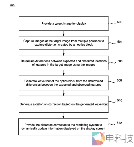 专利描述了量化瞳孔游离及补偿瞳孔游离的方法。在一个实施例中,目标图像显示在头戴式显示器的显示器中。在头显的出射光瞳位置,相对于头显光学模块的光轴并从多个位置捕获目标图像的图像。目标图像包括特征,以及特征观察位置和预期位置之间的差异。根据所述差异,重建光学块的波前,并利用波前生成光学块的畸变校正。当应用于虚拟场景时,畸变校正添加由光学块的光学缺陷所抵消的预畸变。