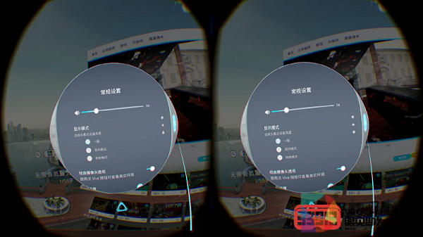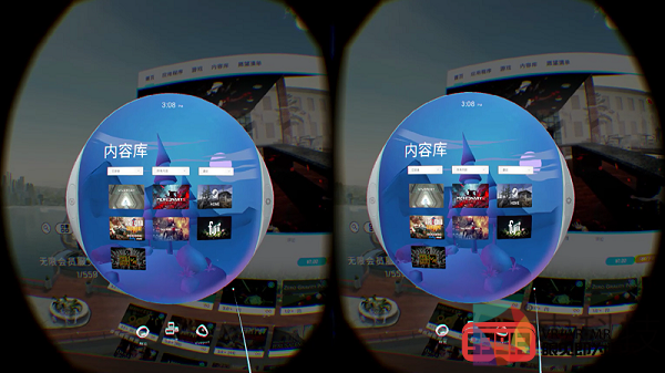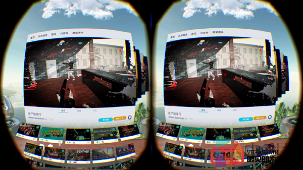 进入VIVEPORT,我看到了再熟悉不过的界面:在画面中央区域,系统的内容栏分别显示首页、应用程序、游戏、内容库等栏目,用手柄的光标指向某个栏目并点击扳机键,即可查看相关内容。这里需要说明一下,在有关Vive系统应用的体验中,我们截取的都是镜像画面(即左右分屏的画面),而在之后的游戏体验中,我们截取的都是相关游戏在PC显示屏上输出的画面(非左右分屏)。