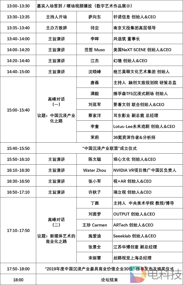 2019中国首届沉浸产业发展论坛将以“全球沉浸产业的现状及发展趋势”、“资本助推中国沉浸产业的发展”、“中国沉浸产业开发未来方向”、“沉浸娱乐的价值与拐点”、“中国沉浸产业化之路”、“新媒体艺术的商业化之路”等为话题。届时,多位专家与产业代表将围绕上述话题通过主旨演讲、高峰对话等形式进行深入探讨与分享,解读新技术、洞悉新趋势,探索产业发展之道。