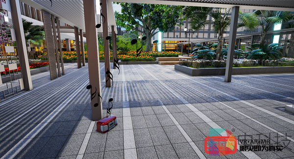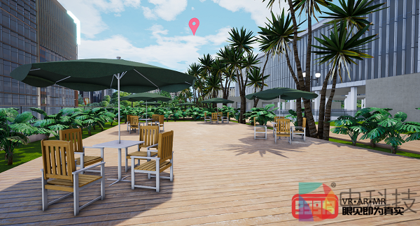 在VR模式下,直逼眼睛的VR头显带来了沉浸感的进一步提升——由于视野被VR完全占据,体验者就好像“穿梭”到了园区现场。而更换场景的操作也很简单,只需将VR眼镜中的“视觉焦点”对准红色的“区位指标”(如上图所示),等待进度条满载即可实现“瞬间位移”。得益于精确的大小比例,VR视角下的各种景观呈现出以假乱真的效果!以场景“楼顶花园”为例,天空的光照、遮阳伞投下的阴影、摇曳的绿植等种种逼真的细节使沉浸其中的体验者仿佛回到盛夏。
