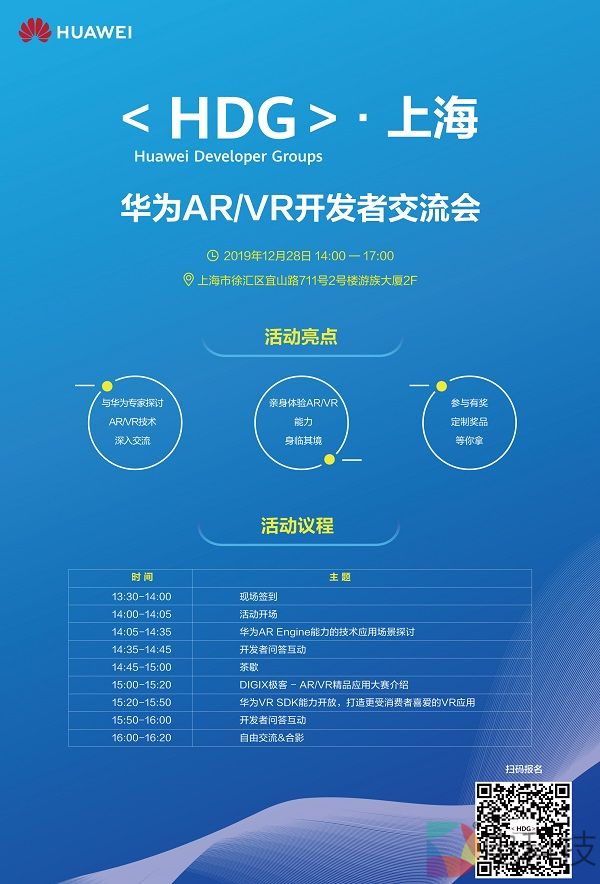 HDG上海站-华为AR/VR开发者交流会,邀请到了AR/VR开发部技术专家和业务负责人,分享和交流华为AR/VR相关技术,介绍DIGIX极客-AR/VR精品应用大赛,开发者还可现场体验和感受相关产品。
