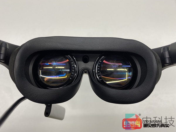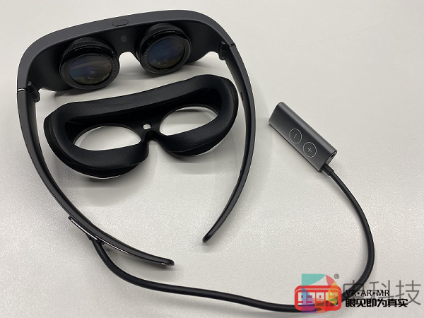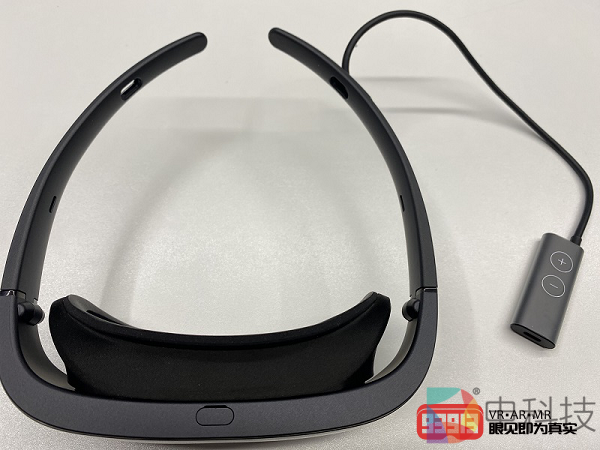 在单独观察这款产品的主体部分——VR眼镜时,我看到在其左镜腿尾部有一根数据线延伸出来,这根数据线的末端还配有一个类似线控的装置及Type-C接口。在具体使用过程中,用户需要通过C2C线缆连接VR眼镜与智能手机,之后即可正常使用VR眼镜。说到这里,或许眼尖的朋友会看到VR眼镜的顶部有一个圆角矩形的接口,究竟这个接口是做什么用的,这里还恕我先卖个关子,后面自会揭晓。
