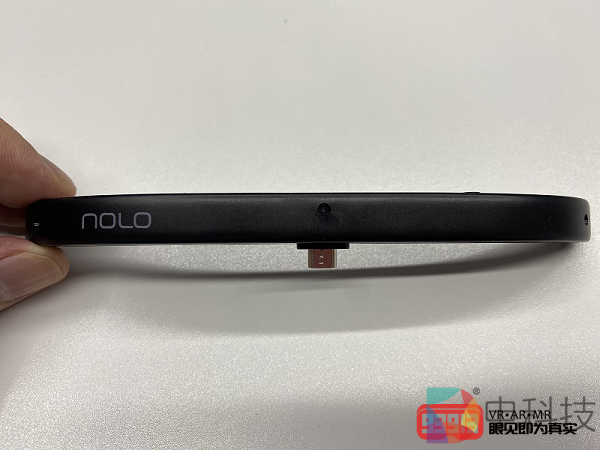 将NOLO CV1 Air的头盔定位器单独取出,我发现它非常轻薄小巧,其上有一个指示灯和配对按钮,其下有一个数据接口。满满的科技质感,同样体现出NOLO VR不俗的技术力。