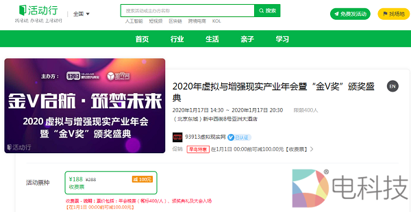 目前,2020虚拟与增强现实产业年会暨金V奖颁奖盛典活动行购票报名已开启,在2020年1月1日 00:00前购票可减100.00元,票价包括:大会入场、颁奖典礼、年会晚宴。