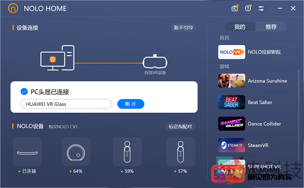 下面我们进行具体的连接与配置。想要顺利连接PC并游玩PCVR游戏,用户需要下载并安装三款最新版本的软件:华为手机助手、NOLO HOME和Steam。