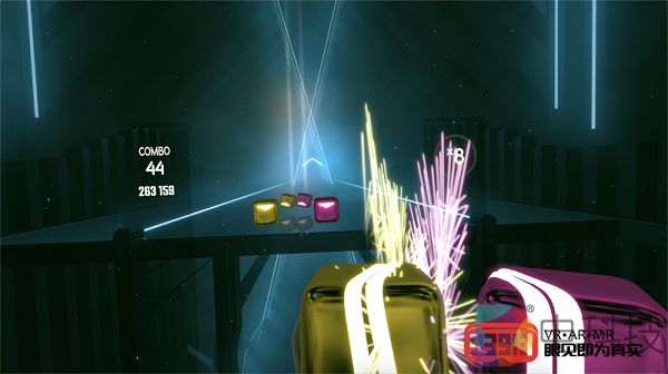 我体验的第一款游戏就是大名鼎鼎的《Beat Saber》。作为一款音乐节奏类游戏,《Beat Saber》对于VR设备的定位精度及延迟要求很高,试想一下,如果用户使用的VR设备定位不准且延迟过大,那么这款游戏肯定是没法玩的。在实际体验过程中,NOLO CV1 Air与华为VR眼镜的组合表现非常出色,游玩全程定位精准且延迟很低,我完全没有产生一点卡顿的感觉。