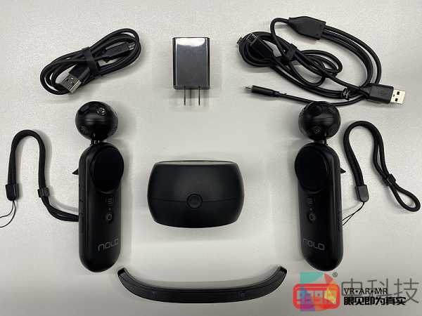 首先,让我们再简单回顾一下华为VR眼镜与NOLO CV1 Air所包含的部件。华为VR眼镜包含的部件包括一副VR眼镜、一个手柄、一根绑带(用于固定头部)以及一根专用Type-C 3.1高速数据线(后简称C2C线缆)。NOLO CV1 Air包含的部件包括一个定位基站、两个交互手柄、一个头盔定位器、一个电源适配器、一根一分三充电线、一根数据线以及两根手柄固定带。