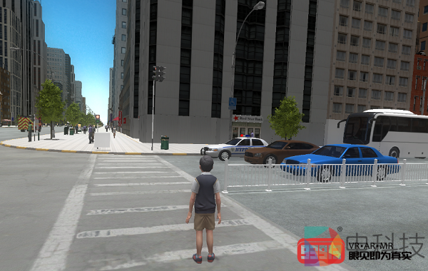 行人安全警示演练选取了“闯红灯”、“横穿马路”以及“跨越护栏”等三个现实中典型的行人违规现象,通过3D建模重现城市道路场景,体验者跟随场景中的主人公依次体验不按交规过马路,并由此了解行人交通安全过程中的重要注意事项。