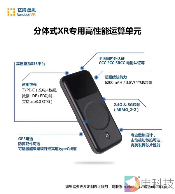 高性能XR处理主机产品:高通835主控、双type-C接口设计、支持数据+DP+PD功能、支持USB3.0TG、超强续航能力(7000mah)、专业散热设计、主动被动散热可选、快充3.0、完美发挥芯片性能、2.4G&5G双频天线(MIMO2*2)、全面国内外认证(CCC/FCC/CE/UL/SRRC/电池认证UN38.3等等) 、GPS/防摔配件可选、可配置超级柔软高速type-C线缆。可以适配市面主流Type-C接口AR头显,同时现场展示各光学合作伙伴最新光学方案。