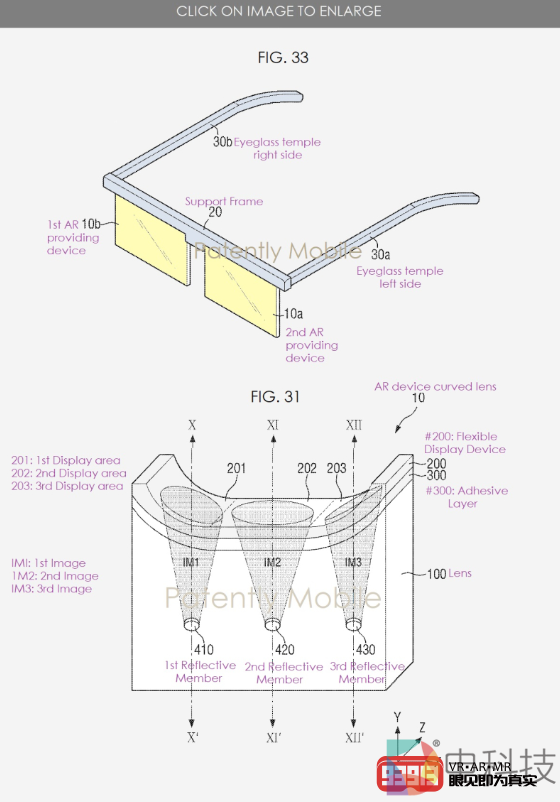 上个月底,美国专利商标局发布了三星AR智能眼镜最新专利。FIG.33显示了一副增强现实眼镜,其包括增强现实设备#10a和增强现实提供设备#10b,支撑框架#20以及眼镜腿#30a和#30b。FIG.31显示的是增强现实眼镜透镜的透视图。