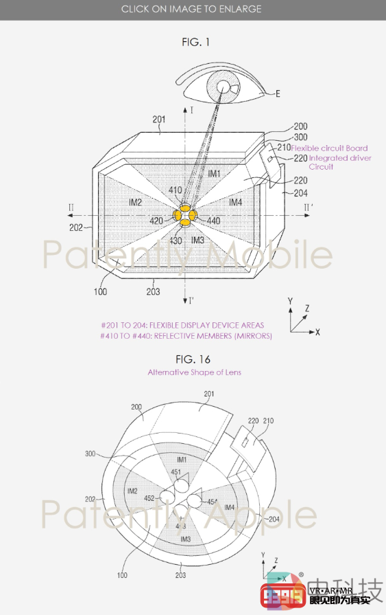 为了扩大柔性显示设备#200的用户的眼睛E可见的区域,即用户的视场(FOV),透镜可以包括多个第一反射构件(#410),多个第二反射构件(#420),多个第三反射构件(#430)和多个第四反射构件(#440)。