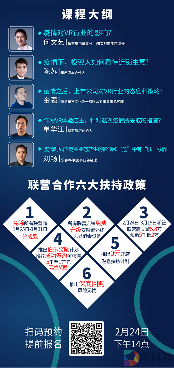近段时间以来,一场突如其来的新冠状病毒肺炎疫情牵动着全国人民的心,目前举国上下共同抗击疫情。在疫情之下,实体行业大多都遭受不同程度的损失,VR线下娱乐行业与其他各行业一样,面临着现金流短缺和业务大幅下滑等休克性伤害,我们是否能快速站稳复苏,将对未来行业的发展产生重大影响。在疫情之后,VR线下娱乐行业,要如何灵活应变,转危为机?农历的二月二是“龙抬头”,在这一天乐客VR将应对逆境,为行业发声。由乐客VR发起,93913虚拟现实网、和君资本、恒信东方、有家嗨店共同参与的线上沙龙将于2月24日下午14点举办,本次沙龙主题为“疫情之下,VR线下行业的危与机!”旨在为VR线下从业人员重新建立信心,为行业复苏做好准备!