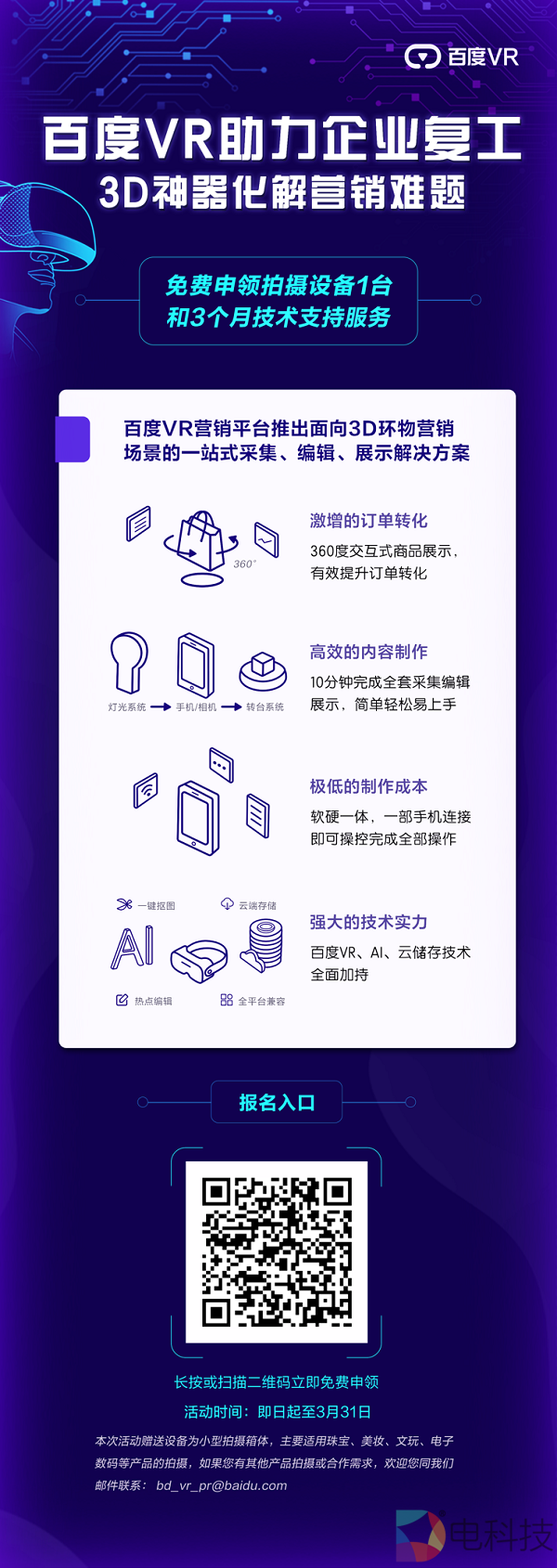百度VR营销平台推出了围绕3D环物营销场景的一站式采集、编辑、展示解决方案,此次活动将重点帮扶珠宝、美妆、文玩、电子数码等领域具有新营销需求的中小型企业。即日起至3月31日,凡有相关需求并符合条件的企业,申请参与活动即有机会获得百度VR赠送的适用于VR营销素材拍摄的小型拍摄箱体1台(活动将共计送出100台),同时配套提供3个月免费技术服务,总价值100000余元。