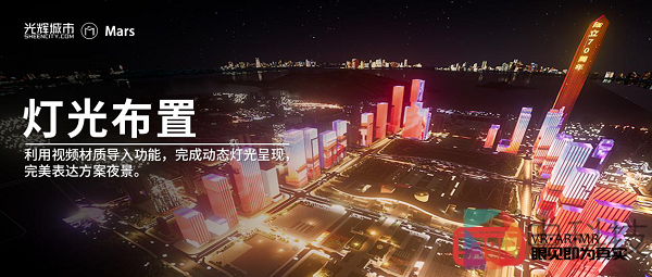 除了建筑设计,今年光辉城市计划向着更多领域进行扩展,而这正好就是Mars2020的用武之地,因为它面向的是更多领域的设计师甚至包括非设计人员。除了前面提到的景观设计、室内设计等领域,一些诸如艺术设计、照明、舞美、展览展陈等领域同样可以应用Mars2020。说到这里就不得不提到Mars2020新增的多媒体灯光秀功能:通过在城市景观中添加并编辑视频灯光素材,设计师可以轻松创作美轮美奂的城市灯光秀,而体验者也可以借助VR头显获得仿佛置身其中的临场感,“在城市中亲身体验”灯光秀的实际效果。