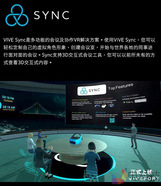 由HTC打造的《VIVE Sync》是一款直观易用的多人VR协作和远程虚拟会议应用。内含七种语言接口,用户可通过虚拟现实技术,进行虚拟现实会议,可支持多达20名员工同时会面,戴上VR眼镜后,我们就能感觉到彼此在同一个空间内交流协作。