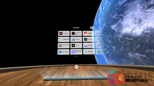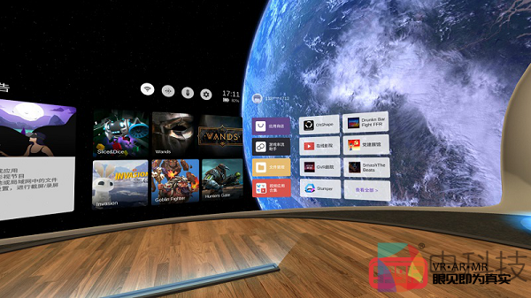 在推荐内容的上方分别显示无线、蓝牙、手柄及设置图标,旁边则是时间、电量及用户图标(用户登录后显示用户名)。熟悉之余,不得不说的就是画面非常清晰,不愧是4K屏。除了这些紧凑的图标与模块,我的周遭则是一个美丽的虚拟世界,一侧是树木,一侧是地球,颇有岁月静好之意境,符合Pico一贯的文艺范儿。