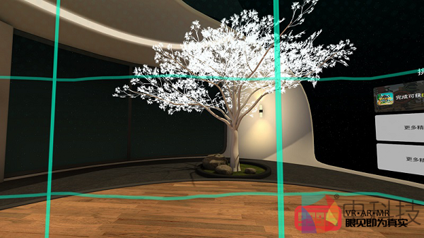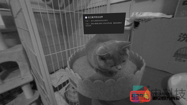 相对于3自由度VR设备,6自由度VR设备最大的不同就是人在虚拟世界是“可动的”,这就自然涉及到用户的安全边界问题。当我靠近安全边界时,系统会自动显示安全边界的框体,提示我不要“出圈”,而当我真正走出安全边界,系统会通过前置摄像头显示外部的真实世界,提醒我赶紧“回圈”。