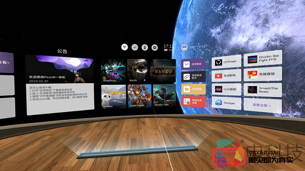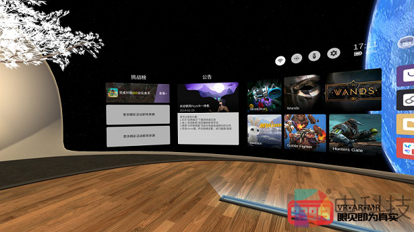 进入Pico Neo 2的HOME界面,我感觉到了一丝熟悉。与之前的Pico G2及Pico G2 4K一致,HOME界面的中央区域是推荐内容,左侧是公告栏(显示系统消息)和挑战榜(显示官方活动),右侧是系统常用的几个模块(应用商店、游戏串流助手、文件管理及视频应用合集)和本地应用列表。