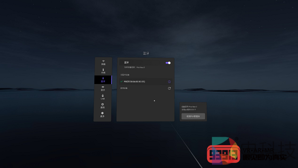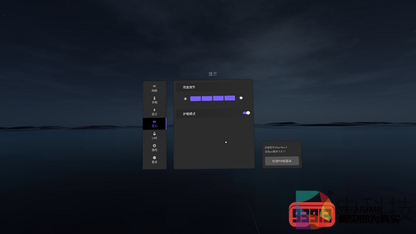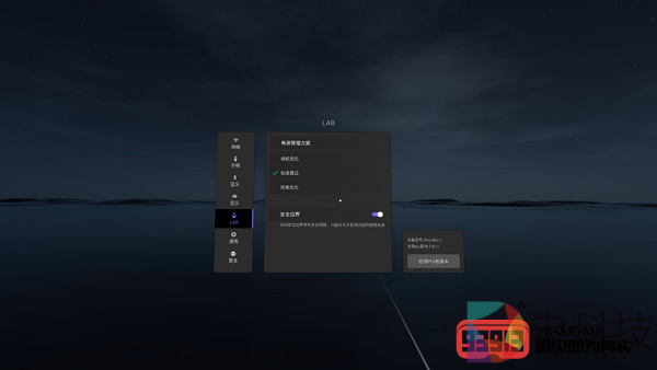 在系统设置模块,用户可以进行各方面的设置,从手柄、Wi-Fi、蓝牙到显示等等,可谓一应俱全。这里我提几个不得不说的点:首先是显示,这几年Pico一直在一体机里提供了护眼模式,开启护眼模式之后,系统画面变换为类似茶色玻璃的色调,对于长期使用的用户而言非常舒适;其次是蓝牙功能,当我通过蓝牙将Pico Neo 2连接到一个蓝牙音箱之后,无论是观影还是玩游戏,我们都可以借助蓝牙音箱获得更好的听觉体验;最后是系统提供了电源管理方案——续航优先、标准模式和效果优先,用户可以根据自身需要进行选择,这点也非常贴心。