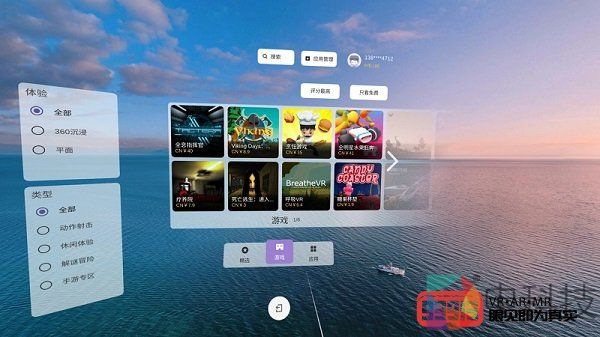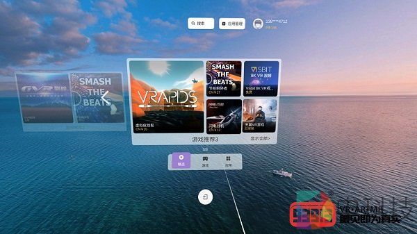 接下来我们说说前面提到的几个常用模块。首先是应用商店,点击图标进入,在我面前的是首页的精选内容,其下的导航栏包括精选、游戏及应用三个部分。点击画面右上角的用户图标可以进行登录,作为Pico的老用户,我用之前的账号进行登录,登录成功之后,我看到了自己的手机号以及P币余额。