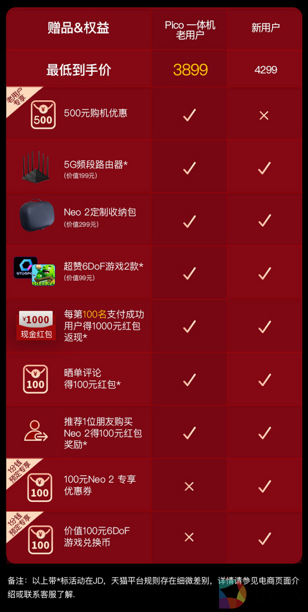 据了解,Pico Neo 2 新品上市定价为4399元,3月16日至24日为预定期,可享1分钱抢100元优惠券+1000P币(价值100元,可在Pico应用商店购买游戏应用)活动;3月25日至27日,新品进行现货开售,届时新用户活动最低到手价为4299元,一体机老用户专享到手价为3899元,每日前100名购买的用户可赢取价值千元的游戏礼包和赠品权益。上述活动在京东天猫平台进行,具体细节可参考对应电商活动介绍。