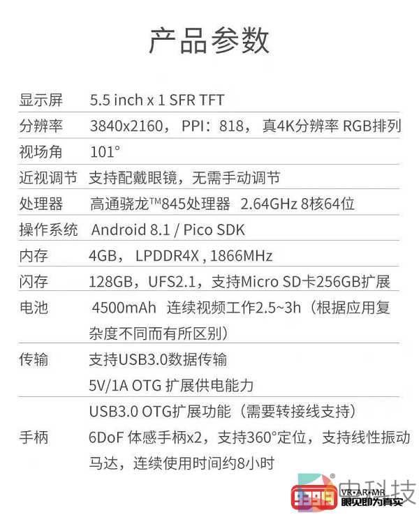 Pico Neo 2硬件配置也进行了全面升级,搭载高通骁龙845处理器,相较上一代产品,性能提升30%,功耗降低20%;采用真4K快速响应LCD屏幕,视场角可达101°,画质更加清晰、细腻、真实; 采用4500mAh后置电池和旋转式绑带设计,满足长时间游戏时的佩戴需求。