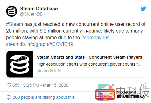 Steam数据库公布了这项新记录,并认为造成同时在线用户如此之多的原因“可能是由于新型冠状病毒而导致许多用户呆在家里”。据报道,在2000万在线用户之中有620万人正在进行游戏。这个数字也打破了将近20万人的现有记录。
