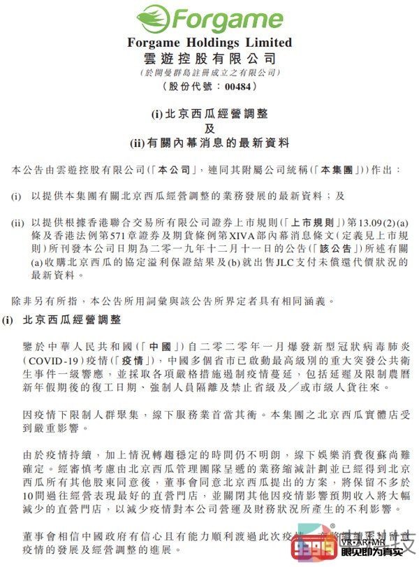 3月10日,香港联合交易所主板上市云游控股有限公司在公告中称,「由于疫情,加上情况转趋稳定的时间仍不明朗,线下娱乐消费复苏尚难确定。经审慎考虑由北京西瓜管理团队呈递的业务缩减计划并已经得到北京西瓜所有其他股东同意后,董事会同意北京西瓜提出的方案,将保留不多于10间过往经营表现最好的直营门店,并关闭其他因疫情影响预期收入将大幅减少的直营门店,以减少疫情对公司营运及财务状况所产生的不利影响。」