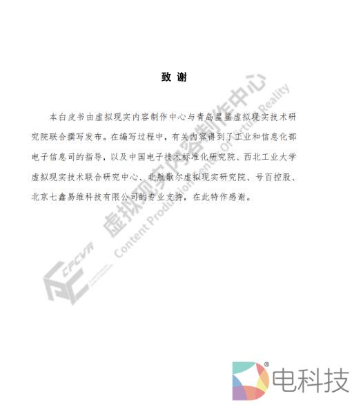 2020年4月9日,虚拟现实内容制作中心发布《虚拟/增强现实内容制作白皮书(2020)》。本白皮书由虚拟现实内容制作中心与青岛星鲨虚拟现实技术研究院联合撰写发布。在编写过程中,有关内容得到了工业和信息化部电子信息司的指导,以及西北工业大学虚拟现实技术联合研究中心、北航歌尔虚拟现实研究院、中国电信号百控股集团、北京七鑫易维科技有限公司的专业支持。白皮书内容涵盖前言、虚拟/增强现实概述、虚拟/增强现实内容制作发展现状及趋势、虚拟/增强现实内容制作标准化建议、虚拟/增强现实行业应用现状及趋势等多个方面。