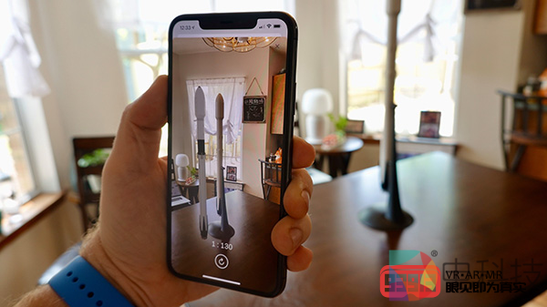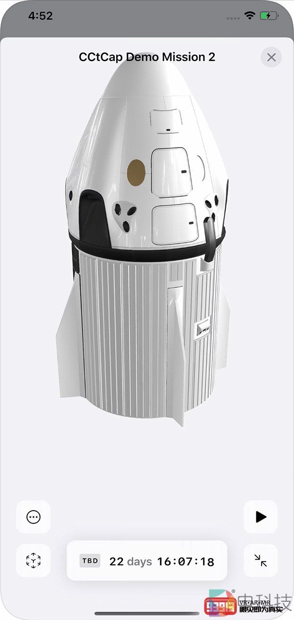 接下来就是AR大显神威的时刻了。轻点苹果的AR方块图标,找到一个平面,然后就可以将SpaceX航天器放置到环境中的固定位置了。这个强大的功能可以让你走来走去,从各个角度去查看3D模型火箭的细节,可以像全屏预览模式一样调整AR版本的大小。