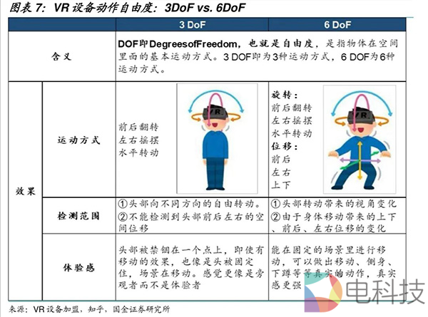 (2)在追踪度方面,虽然主流VR都采用了Inside-Out追踪定位,但在头显、手柄追踪度方面有差异,一些以轻薄、轻便为看点的一体机追踪度只有3DoF,即只能实现注视、摇头点头和方向追踪,无法进行位置追踪,但这对于进行一些影音娱乐、聊天社交甚至移动量不大的休闲游戏来说,已经足够使用。而6DoF相对3DoF而言的最大差异在于增加了3位移变化,即前后、左右和上下位移。