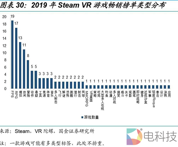 VR设备与用户的独特交互性在于空间体感,预计空间交互专属特性游戏预计率先爆发,如FPS和休闲动作,RPG、 SLG 和MOBA VR游戏可能依序冒出。根据Steam 2019年VR游戏的畅销榜单,我们统计了上榜的82款游戏,FPS游戏占比23.2%,RPG游戏占比20.7%、模拟类游戏占比15.9%,分列前三。而竞速、体育、跑酷、潜行、网球类型合计占比14.6%,比重也不低,初步印证了空间交互性在VR游戏发展初期吸引用户的成果。