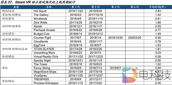 与手游类似,休闲游戏相对开发周期较短,而重大IP游戏开发周期是休闲游戏约2倍以上。以Steam VR游戏隔代上线周期作为开发周期的指标,各品类游戏研发周期平均约1.75年,整体位于半年至4年区间内,相比于国内手游并没有显著差异。根据我们对Steam上有多代的VR独占游戏产品上线时间进行统计,分具有模拟、运动/动作、休闲和冒险类型标签(不排重)来看,Steam VR独占游戏隔代的上限周期分别为1.66、2.33、1.96和1.34年。