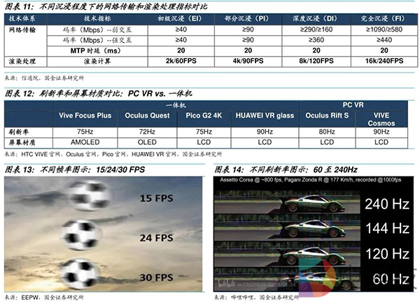 视觉晕动症:屏幕显示延时是用户使用VR设备产生视觉晕动症的主要原因,提高刷新率和帧率可以明显缓解。目前具体存在四种类型的延迟,包括屏幕显示延时、计算延时、传输延时以及传感器延时。其中屏幕显示延时VR设备延时的主要因素。以Oculus Rift为例,Oculus Rift总延时为19.3ms,其中屏幕显示延时13.3ms,延时占比达到69%。而降低屏幕显示延时的最简单方法就是提高刷新率和帧率,减少帧间延时,目前主流PC VR刷新率普遍高于VR一体机,因此PC VR在进行重度游戏时延迟感和眩晕感能有所缓解。在屏幕选择方面,AMOLED的响应时间是LCD的千分之一,显示运动画面不会有拖影的现象,因此未来一段时间,AMOLED显示屏将成为解决屏幕显示延迟的最佳解决方案。