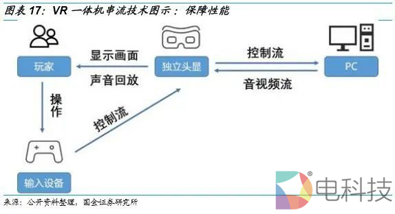 VR一体机与PC VR相比存在性能有所下降的问题,但串流技术可以缓解这一问题,保障性能水平。串流分为有线传输和无线串流,有线传输用一条数据线连接至PC端,如Oculus Quest的Oculus link。无线串流则是将VR头显与PC连接至同一局域网下。通过串流可以将部分计算工作转移至PC端完成,VR头显无需承担过于复杂的计算任务,因此性能表现会相对更好一些。