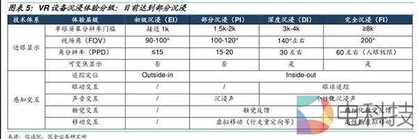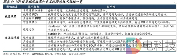 性能指标中视觉效果和交互沉浸感直接影响用户的VR体验,其中视场角和追踪度对于分析VR设备体验具有重要参考意义。视场角越大,同一分辨率下视野范围更广;追踪度越高,沉浸感越深入。