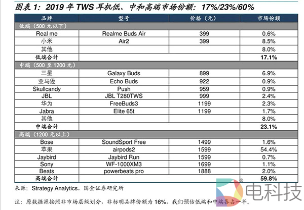 价格下降空间与市场分层:由于其技术的复杂性和制造成本,预期移动VR终端价格会略高于TWS耳机价格,但低于主机价格。我们根据2019年TWS耳机市场份额排名情况挑选了各品牌下最热门的TWS耳机,发现高端产品价位在1499-1888元区间。主机方面,Switch价格为2099元,Sony PS4价格为1899元。因此预期移动VR价格下降到2000元以下时,能够引发一般用户需求的爆发。我们预估移动VR的市场分层情况与TWS耳机类似,大致低、中和高端市场份额分别为17%/23%/60%。