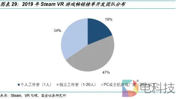 国外独立和个人VR游戏工作室作品成熟度可观,对于国内游戏厂商收购或参投移植成熟经验提供可能性。从国外VR游戏开发商分布来看,以2019年Steam VR游戏畅销榜单游戏信息统计,独立工作室占比47%,PC或主机厂商占比34%,个人工作室占比19%。目前,通用的游戏引擎的适配,如Unity和Unreal Engine 4(UE 4)相对个人和独立工作室比较友好,其中Unity对于市场上大多数主流VR设备都可以原生支持。在VR内容开发过程中独立团队使用通用引擎也比较多。2016年的Vision AR/VR峰会上Oculus创始人Palmer Luckey提到,使用Unity作为游戏引擎的VR游戏占比高达90%。