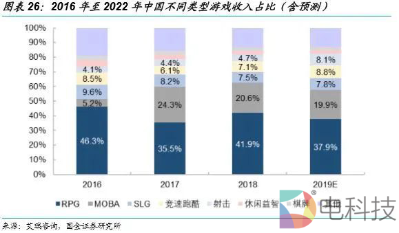 (2)成长期:随着智能手机硬件发展成熟、价格下降,且移动互联网快速普及,手游内容类型喷发,端游转手游的IP红利也表现突出,2011年至2013年,移动游戏用户规模同比增速分别为70%、75%和248%。正因手游并没有仅仅停留在只是强调“手指触碰”的休闲游戏时期,用户基数与行业规模的拓展也依赖于多类型游戏内容的创新,尤其是重度游戏的推进节奏。根据艾瑞咨询的统计数据,2016年至2018年,移动游戏行业贡献收入的主力军分别是RPG、MOBA和SLG游戏,2018年分别贡献41.9%、20.6%和7.5%。