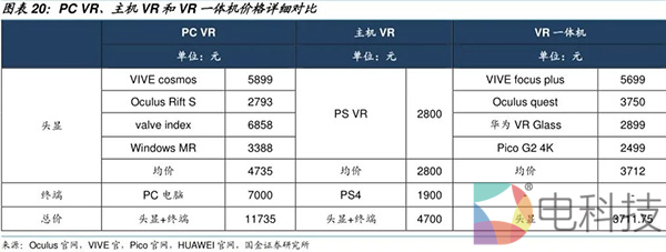VR一体机价格已有明显下降,未来云技术或进一步解放计算过程。选取国内外主流VR设备厂商和代表性产品计算成本,PC VR中选取市场份额最高的四家及其产品HTC VIVE Cosmos、Oculus Rift S、Valve Index和Windows MR,PC终端选择能兼容VR的最低配置,价格约为7000元,头显+终端总价超过1万元。主机VR市场份额最大的为Sony的PSVR,需配备同品牌最低配置PS4,头显+终端总价4700元。而云VR解放终端,头显采用VR一体机。选取2019年发售的4款主流一体机VIVE Focus Plus、Oculus Quest、华为VR Glass和Pico G2 4K,无需终端,设备均价在3712元,远低于PC VR和主机VR。