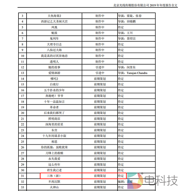 ▲光线传媒年报中的「三体(新)」电影