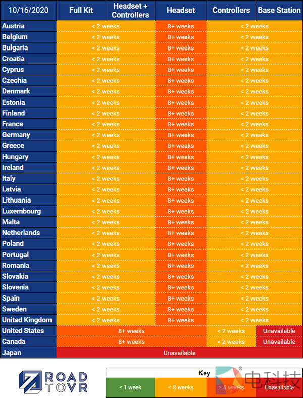 RoadtoVR在调查了Valve Index在31个国家和地区的库存量后发现,除北美(美国和加拿大)和日本以外,除“VR头显(Headset)”外的所有套装预计将在2周内发货。
