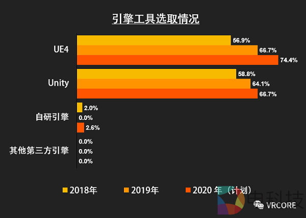 从选择的引擎工具来看,UE4与Unity两款工具的使用率没有明显的差异。但是在新一年的计划中,UE4 有一定的领先优势;选择双引擎作业的团队比例,由2018年的15%左右迅速提升至2019年的30%左右。并且在2020年的计划中进一步提升至40%。双引擎的使用可以丰富团队的技术手段,面对不同需求时可以提供更灵活的解决方案,从而提升团队在获取ToB项目中的竞争力