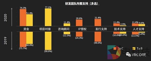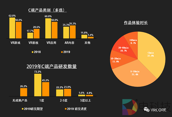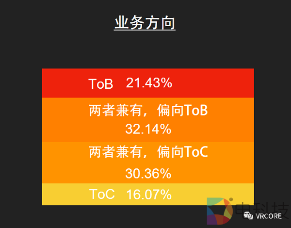 从XR内容团队业务发展方向来看,2019 年,随着团队财务状况的好转,一些团队在有余力的情况下,再次开始尝试进行 C 端内容的研发。但是从整体来看,ToB带来的现金流依然对团队至关重要,业务方向纯 ToC的团队实质上和 2018 年(22%)相比是有所下降的,可以预见的是,在未来市场与行业更成熟之后,业务的分化会更加的明确,ToB和 ToC也会进一步分离。