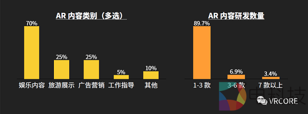 从AR领域来看,AR 内容已经成为 ToC 内容中重要的一环,有大量带有娱乐性质的 AR 内容面向消费端;大部分研制面向 C 端的AR 内容的团队,在过去一年中完成了 1-3 款内容。