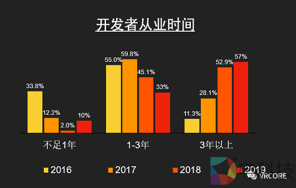 根据我们调查问卷的统计,从团队数量来看,在经历了行业低谷之后,2019 年又开始有新的团队加入到 VR 内容开发的行业中来。